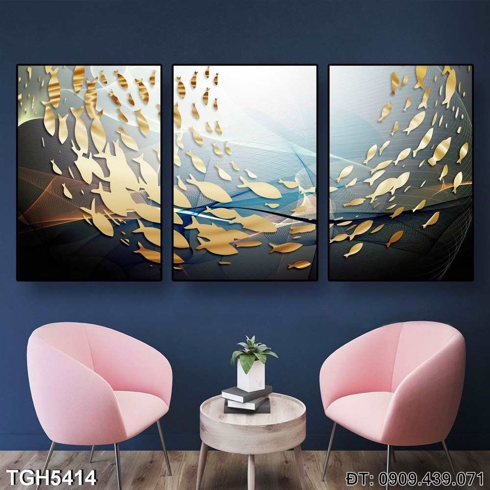 Bộ 3 tranh Cá Vàng Bơi TGH5414 tái hiện hình ảnh những đàn cá vàng bơi lội, tạo nên không gian sống động và vui tươi. Màu sắc tươi sáng và thiết kế hiện đại rất thích hợp để trang trí phòng ngủ hoặc không gian vui chơi cho trẻ nhỏ.