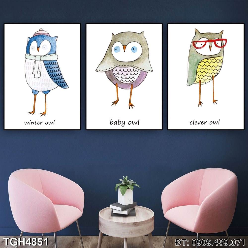 Bộ 3 Tranh Ngộ Nghĩnh Ngây Thơ Của Cú TGH4851 tái hiện những hình ảnh dễ thương và ngộ nghĩnh của loài chim cú. Bộ tranh với màu sắc rực rỡ và hình ảnh sinh động tạo nên một không gian ấm áp, rất thích hợp để trang trí phòng bé, mang lại cảm giác dễ chịu và vui vẻ.