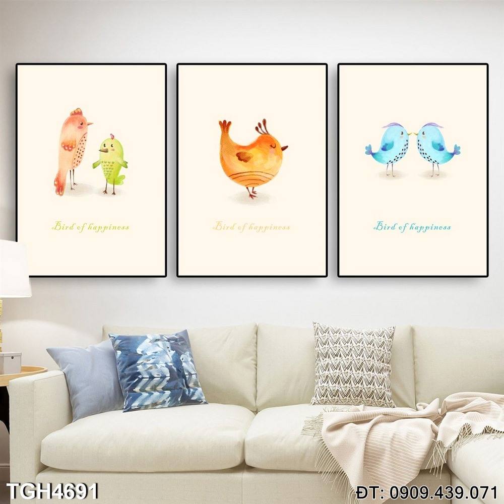 Bộ 3 Tranh Những Bạn Chim Dễ Thương TGH4691 khắc họa hình ảnh những chú chim đáng yêu, gợi lên sự tươi vui và ngộ nghĩnh. Bộ tranh rất thích hợp để trang trí phòng bé, mang lại không khí vui tươi và sinh động cho không gian.
