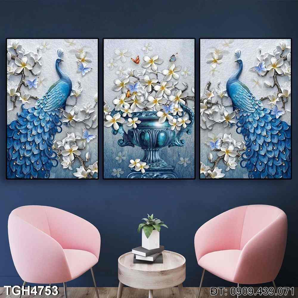 Bộ 3 tranh Tài lộc của chim Công và Bình Hoa TGH4753 khắc họa hình ảnh chim công cùng bình hoa phong thủy, mang lại cảm giác sang trọng và may mắn. Màu sắc tươi sáng cùng với bố cục cân đối tạo nên một không gian tràn đầy năng lượng tích cực, rất phù hợp để trang trí phòng khách hoặc phòng ngủ.