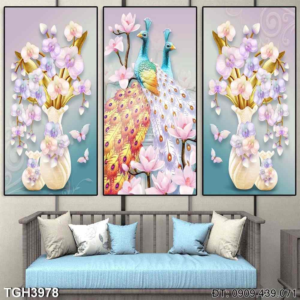 Bộ 3 tranh trang trí Bình hoa và chim Công – Mã:TGH3978