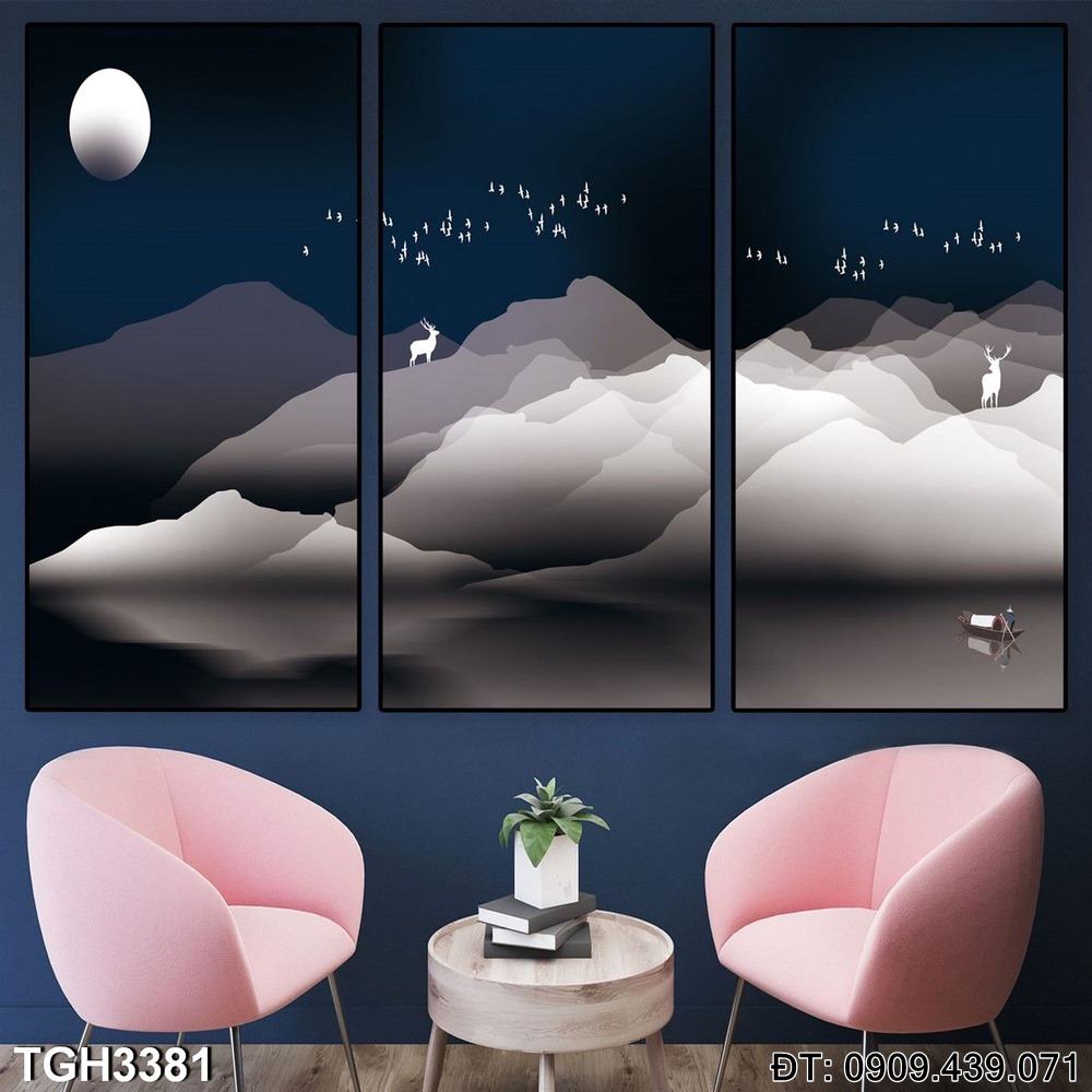 Bộ 3 tranh trang trí trắng đen hươu nai hồ nước – Mã:TGH3381