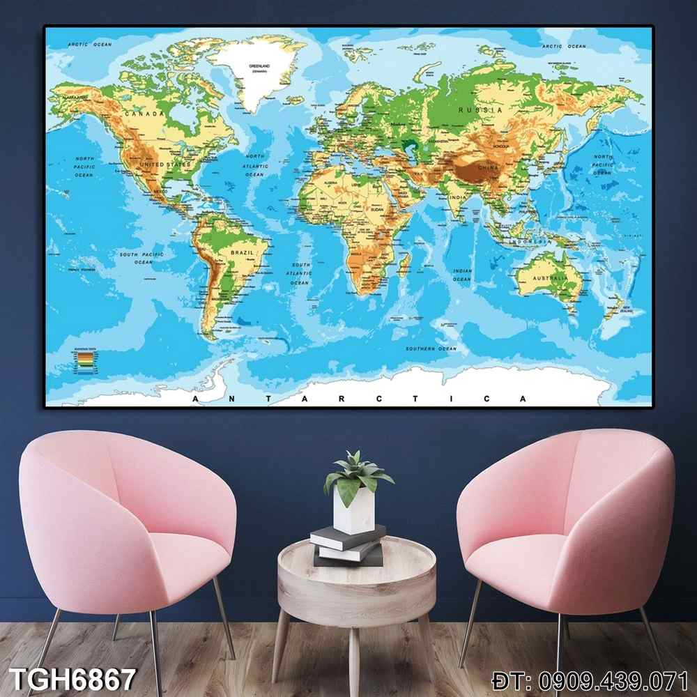 Sản phẩm được sản xuất với chất lượng cao, đảm bảo độ bền và màu sắc rõ nét. Tranh Bản Đồ Thế Giới TGH6867 có giá cả hợp lý, phù hợp với mọi ngân sách.