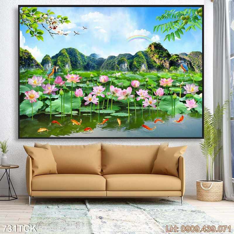 Tranh cửu ngư quần hội đẹp – 731TCK là một sản phẩm nổi bật thuộc chủ đề Tranh hoa sen và thuộc nhóm Tranh decor in nhanh. Nhìn vào tranh, tác phẩm không chỉ thể hiện hình ảnh hoa sen mà còn gợi đến nhiều cảm xúc về chiều sâu của nó. Sự hòa quyện giữa màu sắc độc đáo lẫn tổng quan tạo nên vẻ đẹp đặc trưng cho bức tranh, rất phù hợp nếu bạn đang tìm mẫu treo tường về chủ đề cửu ngư quần hội.