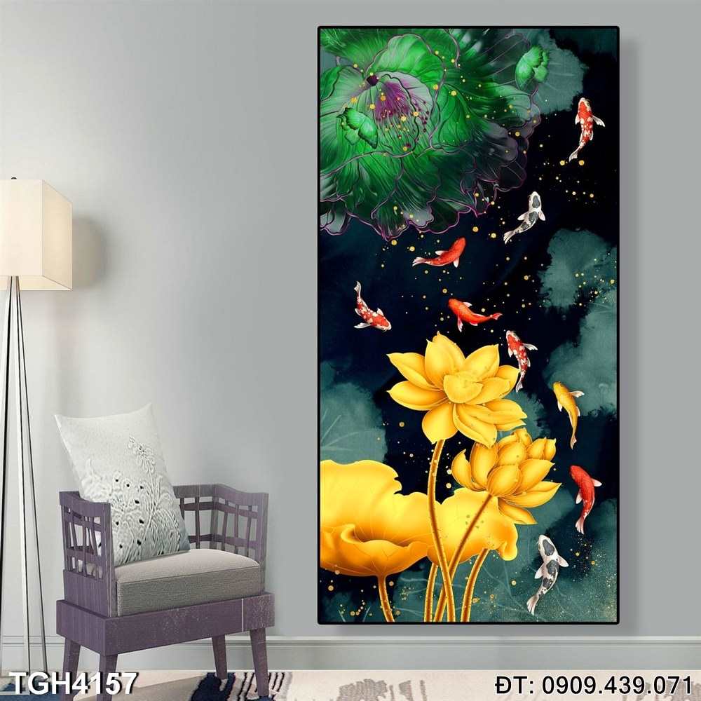 Tranh Hoa sen và đàn cá bơi lượn