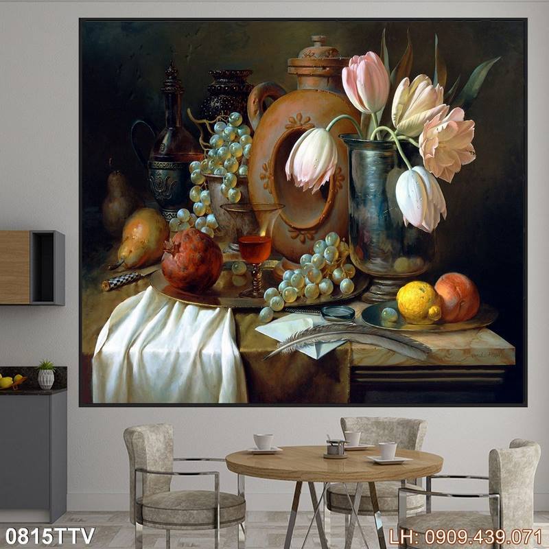 Tranh sơn dầu ấn tượng – 815TTV là một sản phẩm được yêu thích thuộc chủ đề Tranh sơn dầu tĩnh vật hoa quả và thuộc nhóm Tranh phòng khách theo yêu cầu. Nhìn vào tranh, tác phẩm không chỉ thể hiện hình ảnh tranh phong cách sơn dầu, tĩnh vật hoa quả mà còn mang đến các cung bậc về chiều sâu của nó. Sự hòa quyện giữa ý tưởng chi tiết lẫn tổng quan tạo nên vẻ đẹp riêng biệt cho bức tranh, rất phù hợp nếu bạn đang tìm mẫu trang trí về chủ đề sơn dầu.