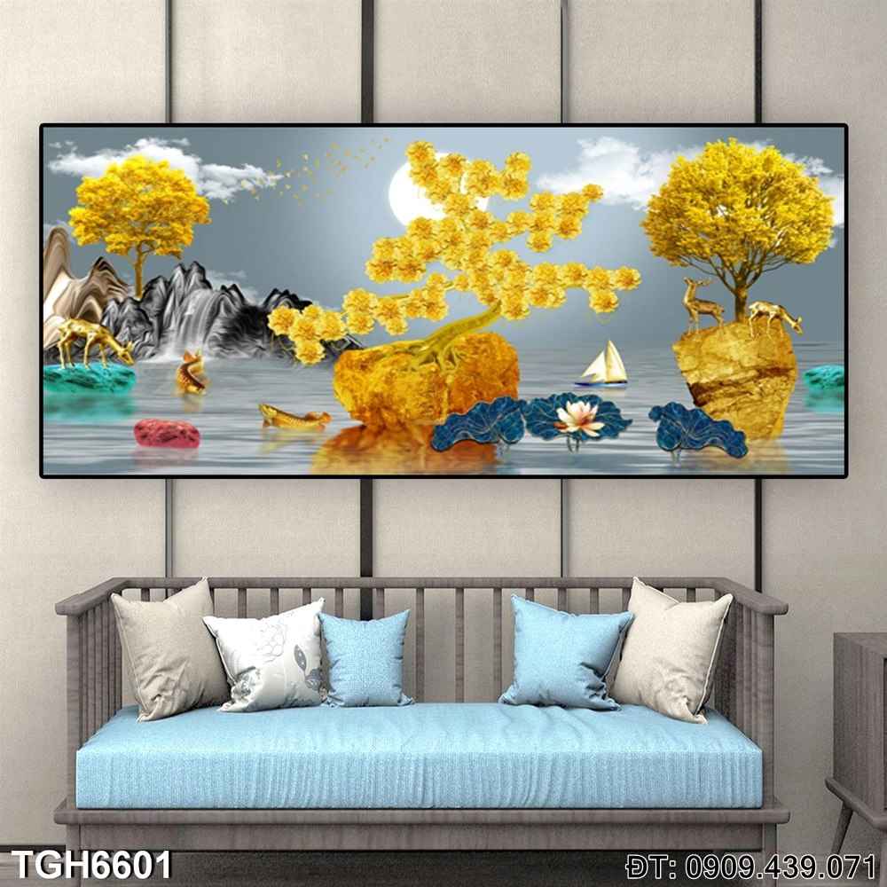 Tranh Sông Núi Vàng TGH6601 mang đến một hình ảnh ấn tượng về sự kết hợp giữa sông và núi với tông màu vàng rực rỡ. Thiết kế trang nhã và sang trọng của tranh tạo ra một không gian đậm chất tài lộc và may mắn, phù hợp để trang trí phòng khách hoặc các không gian cần sự tươi mới và năng lượng tích cực.